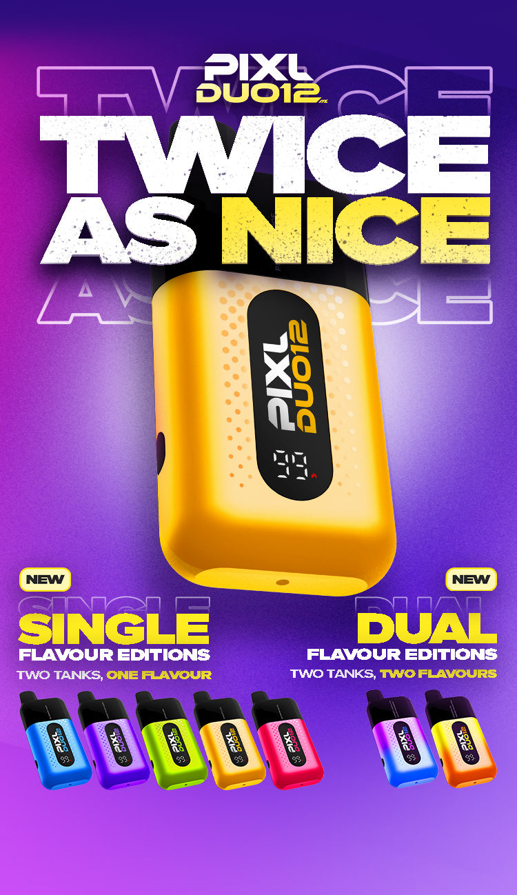 Discover double the flavour with the PIXL Duo Legal Big Puff Disposable Kit. Effortlessly switch between two flavours with the rotatable mouthpiece. The kit also features a boost switch and hyper mesh dual coils that offers 6000 puffs.